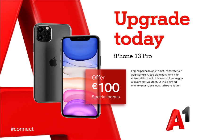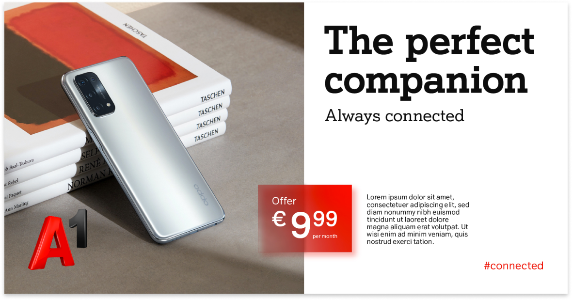 All A1 Logos have been optimised to work harmoniously with the design elements and in all channels, offline and online. The logos are all freed of their white box and the Red A has been optimised for digital use. The new options for logo landscapes offer a wide range of creative solutions and designs to make A1 stand out even more.